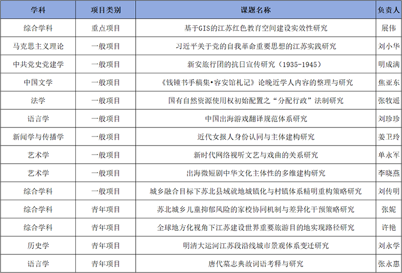 日前,江苏省哲学社会科学规划办公室公布了2025年江苏省社科基金年度项目立项名单,淮阴师范学院共有14个项目获得立项。其中,重点项目1项,一般项目9项,青年项目4项。